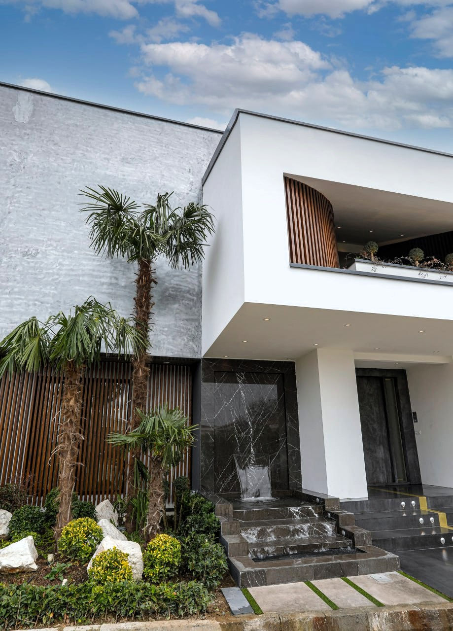 This custom-designed villa features clean lines, natural materials, and a distinctive curved façade blending white plaster, stone, and wood slats. A striking entrance with black marble cladding and a cascading water feature sets the tone for sophistication.